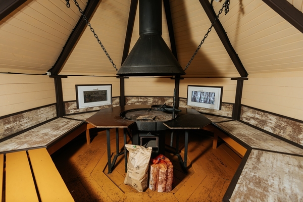 Внутри домика находится очаг, вокруг которого расположены лавки на 10 человек. Это создает удобное пространство для общения и наслаждения пищей, приготовленной на гриле.